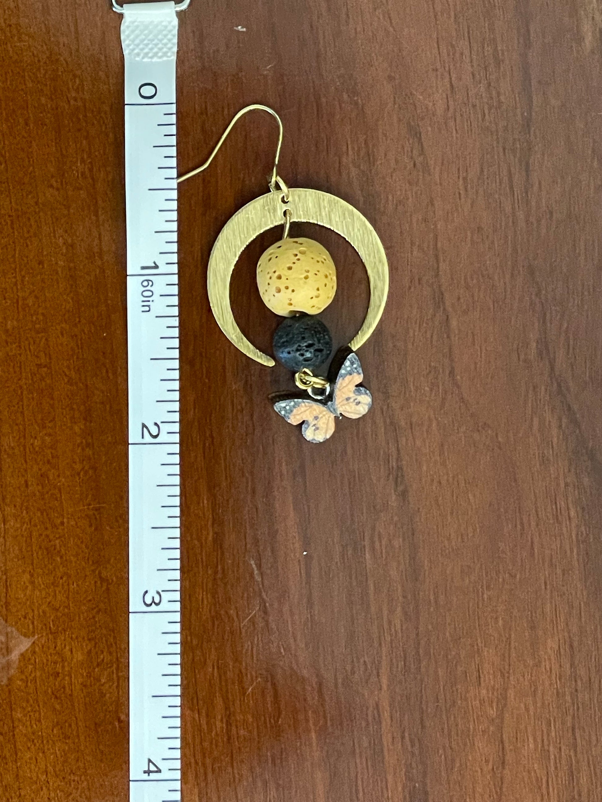Celestial butterfly earrings. Raw brass , lava beads and wood