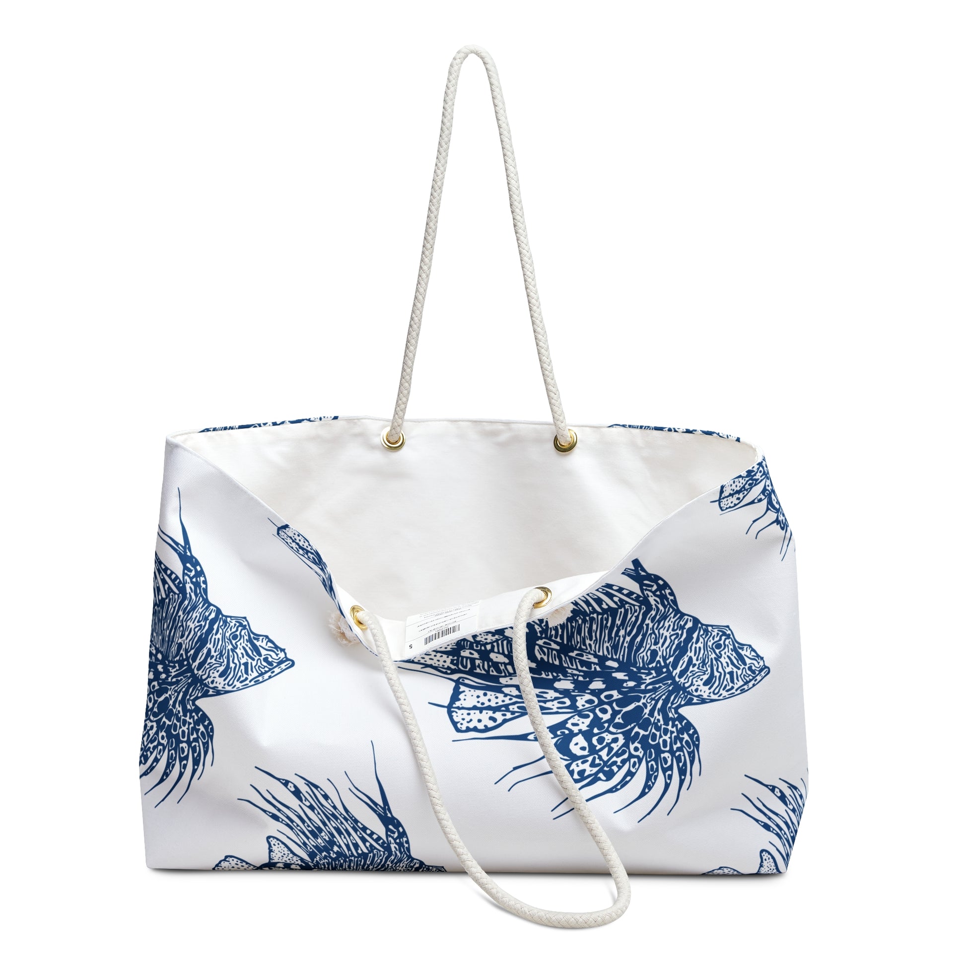 Our oversized Weekender Tote is perfect for your weekend at the beach or in town. The wide-mouthed, durable bag holds a generous amount of personal items and is easily held by its thick rope handles. .: 100% Spun Polyester .: T-bottom .: Cream sheeting interior lining .: One size: 24" x13" (60.9 cm x 33 cm) .: NB! Size tolerance 0.75" (1.9 cm))
